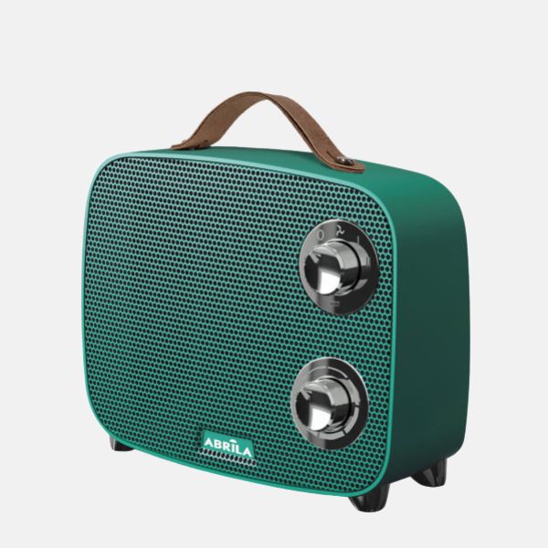 Termoventilador Cerámico PTC eléctrico de la serie CORCEGA en color VERDE y detalles en CROMO. Realizado en metal, placas cerámicas y policarbonato. Equipado con 1500 watios de potencia, Termostato Regulable y con CORTE TERMICO DE SEGURIDAD, permitiendo ajustar entre dos niveles de potencias de calefacción, 1000 watios y 1500 watios. Con tres funciones : ventilador, aire cálido y aire caliente, distribuyendo el aire caliente por toda la habitación gracias a su función ventilador, y con triple sistema de seguridad: protección contra sobrecalentamiento, Interruptor Antivuelco y rejilla de protección. Se presenta con un diseño muy moderno y original, nos recuerda a una radio retro lo que lo hace ideal para tomar parte también en la decoración de estancias, con estilo Vintage muy acorde con muchos nuevos estilos de decoración. Muy fácil de transportar gracias a su tamaño y al asa que contiene. Tiene unas dimensiones de 21x23x13,6 centímetros. En esta serie podemos encontrarlo e color negro/cromo, blanco/cromo y verde/cromo.